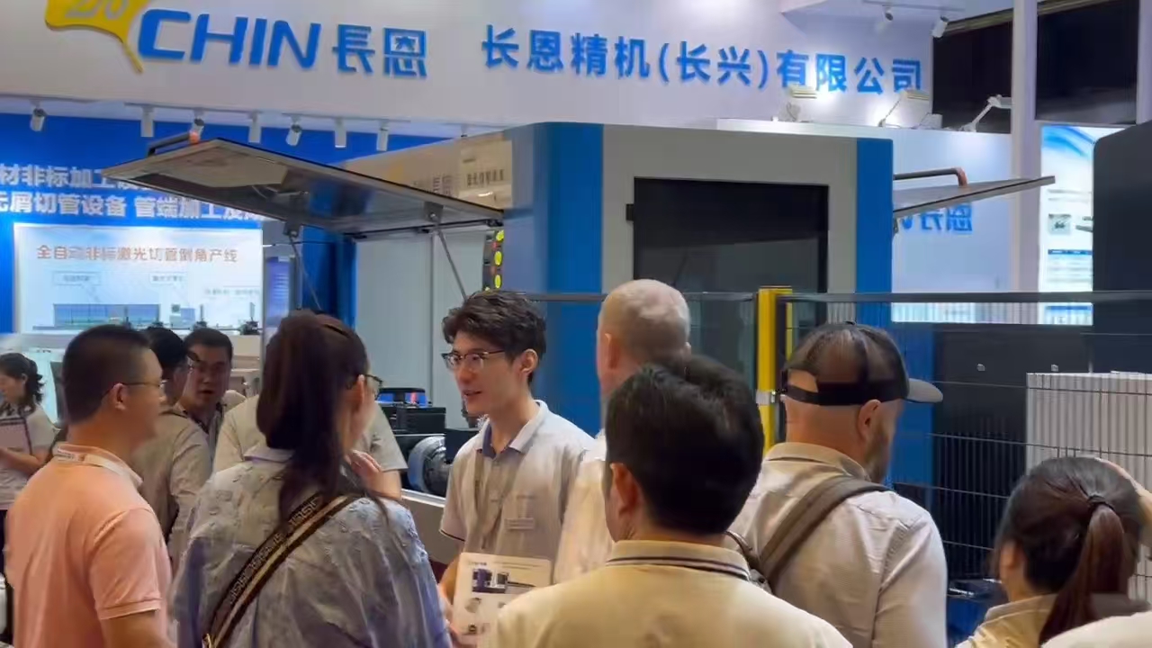 这条管材全自动加工产线,采用激光等多种切管模式,实现全自动倒角与管端成型。它不仅能够完美满足目前企业的管材加工需求,更是在效率上远超传统管材加工方式。客商们纷纷驻足,仔细观看长恩精机展出的设备,无不被其高效、精准的性能以及智能化创新工艺所深深吸引。