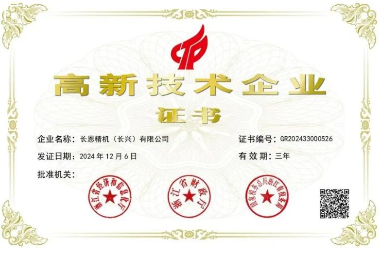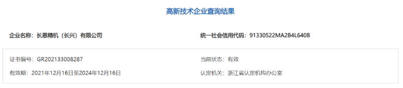 2024 年 12 月 26 日,浙江省高新技术企业认定公告在官网重磅发布,长恩精机(长兴)有限公司凭借卓越实力入选。